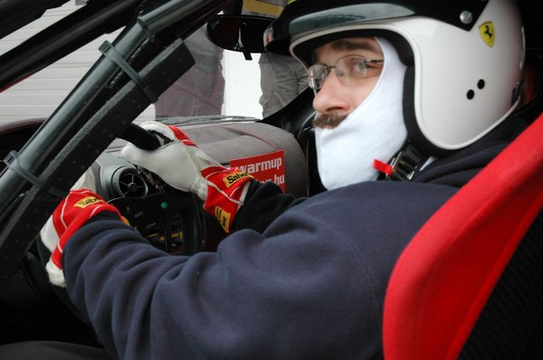 Itt egy pillanatra meginogtam. Ismeretlen és villámgyors versenyautó alig ismerős pályán – még egy Kispolszki is ijesztő lenne ilyen körülmények között, ez meg egy 490 lovas, versenyzésre használt Ferrari. Ráadásul akadt még egy akadály: vezetni csak erre való cipőben engedtek, viszont ebből 43-as volt a legnagyobb, ami épp két számmal kisebb a szükségesnél. Itt azonban már nem futamodhattam meg: felhúztam a csukát – járni persze alig tudtam benne, de pedált nyomkodni talán jó lesz – és elindultam az autó felé. Tibor beleegyezett, hogy eljön velem, és egy kicsit instruál menet közben. A beszállás már flottul ment az előzőhöz képest, felkerült a versenyzőkesztyű is – itt már nem volt visszaút, menni kellett.