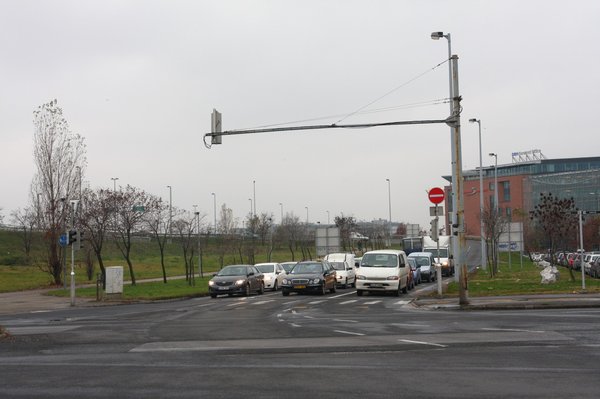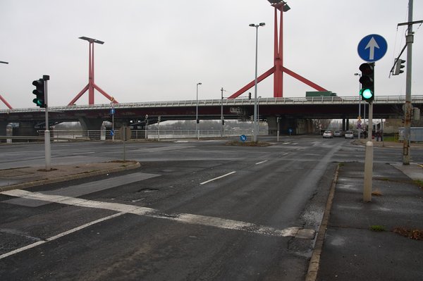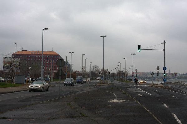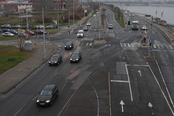 Még egy apróságot megfigyeltem. A hídra vezető utat innen érkezve sem jelzi semmi, ellenben van pár szaggatott vonal, amely a kanyarodási irányokat követi. A belső sávból egy ilyen vonal pontosan a lehajtóra vezet, ez azonban a hídről érkezőknek szól. A fényképen nem annyira látványos ez a vonal, mivel egy útfelbontás után, pár méteren nem pótolták a felfestést. Ahogy a többit sem.