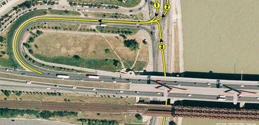 Az 1-es útvonal szerepel az éjszakai videón. Itt egy kötelező haladási irány táblát figyelmen kívül kell hagyni, majd utána nem észrevenni az egyetlen behajtani tilos táblát. Nem is olyan nehéz, mivel a túlsó oldalon meg sem ismétlik. Ehhez – ha az eső miatt láthatatlannak tekintjük a kopott nyilakat – kétszer kell figyelmetlennek, vagy szabálytalannak lenni. Ebből az irányból érkezve egyáltalán nem nyilvánvaló, hogy merre vezet a hídra az út. Pár száz méterrel korábban ugyan van egy tábla, az út bal oldalán. A kereszteződéshez érve nincs semmi támpont.