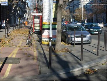 Nézzünk egy példát: Bajcsy-Zsilinszky út Budapest kellős közepén, 2x2-3 forgalmi sávval, és egy – a belvárosi oldalon lévő járdára helyezett – kerékpárúttal. Itt kell kerékpározni mindkét irányba. Pedig ennek kötelező használata a közlekedés biztonságát igazán nem növeli, ellenkezőleg, új veszélyforrásokat teremt és konfliktusokat generál a közlekedés többi résztvevőivel, de gyors és akadálymentes haladást sem biztosít. A járdára vagy mellé épített kerékpárút a jog szerint úttest, az azon egyenesen közlekedőnek például elsőbbsége van a kanyarodó járművel szemben. Csak ezt senki nem tudja/tarja be. Érthető módon: nem természetes, hogy a járdán jármű halad. Ez az oka, hogy a legtöbb kerékpáros baleset lakott területen belül ilyen helyeken történik. Ráadásul a kétirányú kerékpárutat az ellenkező irányba haladva is kötelező használni. Ez – ha a kerékpár vezetője szabályosan közlekedik – további két balesetveszélyes úttesten való átkelést jelent, egy néhány száz méteres út kedvéért. És végül, az hogy ez a létesítmény a járdából lett elválasztva, szinte garantálja a konfliktusokat gyalogosok és kerékpárosok között. Meg azt, hogy azon a járdán nem lehet többé önfeledten sétálni, bámészkodni, hogy az ottani kávézók már biztosan nem települhetnek ki a járdára teraszukkal, mert valaki azt találta ki, hogy ott jármű közlekedjen.