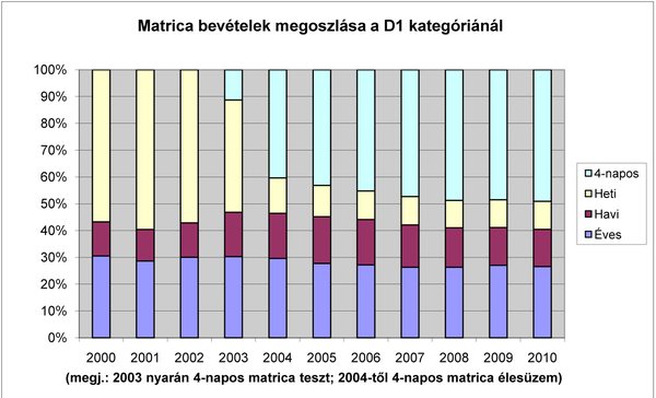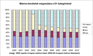 Hatforintos tarifával számolva ekkora távon már nagyobb a kilométerdíj, mint a matrica ára. Viszont jobban járnának, akik csak nagy ritkán utaznak a sztrádán, például Budapestről havonta kétszer látogatják meg Győrben a nagymamát. Ha valóban lehetővé teszik, hogy a közlekedők maguk döntsenek a kilométerdíj és az e-matrica között, sokan lesznek, akik még spórolhatnak is. Más kérdés, hogy mindez visszaüthet, amikor majd megszűnik a matrica, és csak a kilométerdíj marad. Noha még sok minden képlékeny az ügyben, a kormány biztos abban, hogy már a vegyes rendszertől is jókora pluszbevétel várható. A fejlesztési tárcánál úgy vélik, az előzetes becslések szerint a kilométerdíj bevezetését követő első teljes évben mintegy 45 milliárd forint többletbevétellel lehet számolni. „A várható mintegy 90 milliárd forintos összes útdíjbevétel a személygépkocsikra számított 30 milliárdnyi e-matricás és a tehergépjárművekre kalkulált 70 milliárdnyi elektronikus útdíjas bevételből áll össze az üzemeltetési, ellenőrzési költségek levonása után."