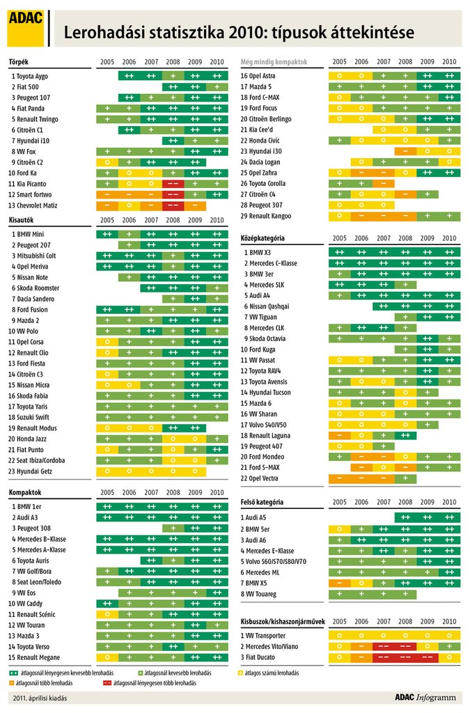 Meglepően kizöldült az évről évre közzétett ADAC lerohadási statisztika 2010-ben. A hivatalos kottázás szerint átlagosnál rosszabb típus alig van, azok is inkább csak egyes évjáratokban gyengélkednek – már azon a hat éven belül, amíg elér a táblázat. A pirossal és narancssárgával jelölt évjáratokat ezek szerint érdemes elkerülni használt autó vásárlásánál, ha hihetünk a németeknek.