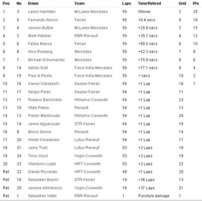 Úgy tűnik, Lewis Hamilton képes összeszedetten, precízen és gyorsan menni. Ha nincsenek körülötte zavaró tényezők, mint pl. Felipe Massa, akkor össze sem akad senkivel. Szép győzelem volt tőle, kellett már neki, mint egy falat kenyér, hiszen utóbbi időben népszerűsége erősen megcsappant, csapattársa, Jenson Button került az előtérbe.