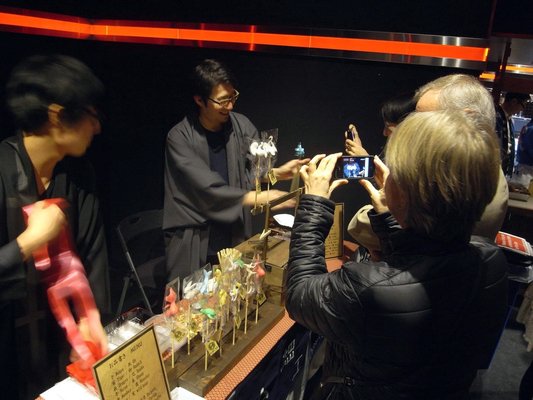 Körben lampionokkal, nyers fából ácsolt asztalokkal berendezett, tradicionális szolgáltatóöltözetbe (de nem kimonóba) öltözött szakácsok, yakisoba, rahmen, takoyaki, kakinokitane – kaják mind, nézzék meg a guglin, ezek az egyszerűbb fajta japán ételek. Zabálunk, jóféle japán sört iszunk, bár lenne bor, whisky, sake is. Elég jó kis buli kerekedik, japán hoszteszek is előkerülnek, bárki odamehet hozzájuk, fotózkodhat velük. És Polaroidra, lol. Welcome to the Seventies... Én kihagyom, nagy lenne a kontraszt a pici, kedves hajasbabákkal.