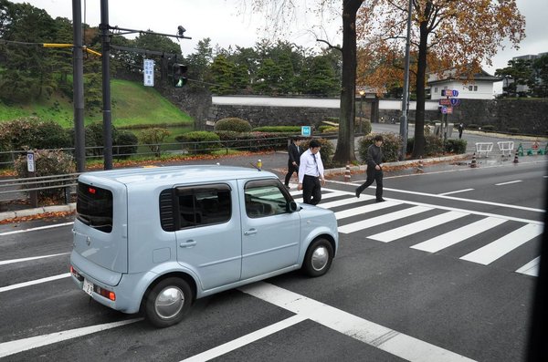 Bár volt már teszten a Totalcaron, s mint tudjuk, Európában is adtak el belőle, a Nissan Cube azért mégis inkább belpiacos autó, mint nemzetközi. Elég sok futkos belőle itt, a sok óriási, csupa szöglet épület között olyan harmonikus a forma, mint a Ferrari Monte-Carlóban. De ez a mai mindent vitt: szürke, klasszikus, domború, pléh dísztárcsákkal. Annyira ömlött rá a nyálam, hogy fel kellett mosni utánam a buszt. Ja, mellesleg éppen a császári palota bejáratánál sikerült elkapni.