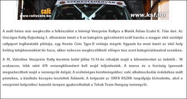 Mára eljutottunk oda, hogy még maga Hoffer Zsolt százados, a bér-Fabiával versenyző rendőrpáros pilótája is megemlíti, mennyire foghíjas a mezőny (létszámilag nagyon csekély), de az interjúban említett problémáik megoldódtak: mindenki nagy örömére a nagynevű, Győrben székelő Európai Kártérítési Ügyintéző Központ (amelyet a PSZÁF 2011 szeptemberében, azaz nem egész egy éve vett fel a biztosítási szaktanácsadók közé) támogatta meg őket, így ott tudtak lenni Veszprémben. Nem jött ki nekik a lépés, írta Facebook-oldalukon, hiszen saját osztályuk két indulója közül nem az elsők lettek. Sokat elmond a mezőnyről, hogy 24 autó szerepel a végeredménylistán. Reklámértékben persze még lehetnek jók, tessék, most is itt vannak az újságban.