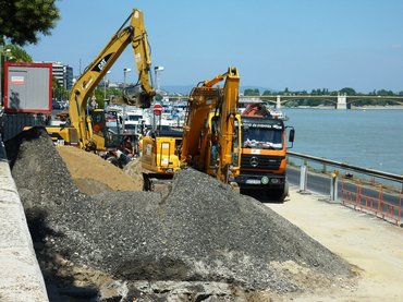 Valódi munka nyomaira csupán néhány kilométerrel később, a Döbrentei térnél bukkantam. A beton és az aszfalt még ott is hiányzik, a munkások nyüzsgése csak a látóhatár végén kezdődik. Ez nem is csoda, mert amikor később megérkeztem a legfeljebb tizenöt fős csapat közös mobilvécéjéhez, láttam, hogy mindenki lázasan dolgozik. Mivel kétkezi dolgozók nem szívesen elegyednek szóba újságíróval, járókelő-pózban közelítettem meg őket. Tőlük tudom, hogy azért kellett átszervezni jóformán a teljes budai rakparti közlekedést, mert kevés olyan fel- és lehajtó van, ahol az autók elhagyhatják az alsó rakpartot a gázcsőépítés helyszíne előtt.