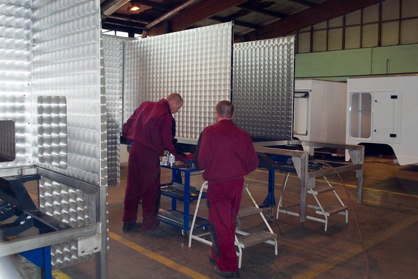 A Heros műhelyében a felújítások mellett gyártanak is, meg lehet nézni a saját tervezésű felépítményvázak szerelését. Számomra meglepően fontos munkaelem a ragasztástechnika: a csavar csak a pontos illesztést segíti, a ragasztó adja a kötést. Ha csak csavarokat használnának, sokkal gyorsabban használódna el a felépítmény. A ragasztó olyan rugalmas kötést ad, ami a 4x4-es, időnként valóban terepen járó autókat érő nagy csavarodási terhelést a legjobban bírja. Valamennyit merevít az alváz is, de hosszabb idő alatt a csavarok környéke kirepedezne. A rakomány nem gyerekjáték: a 4000 literes, új fejlesztésű víztartály mögött két 2000 literes, a pici habtartály mellettük 200 literes. A tűzoltóautóknál 60-as átlagsebességgel számolnak, amiről mindenki tudja, aki számolta már túra időszükségletét, hogy 80-as utazósebességet tételez fel; még terepjárni sem kell, hogy elképzeljük, micsoda csillagászati Newtonméterek tekergetik az alvázakat.