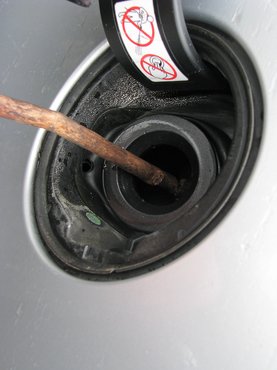 Visszaszaladtam az autópályán keresztül a kocsimhoz, nem vágta senki telibe hátulról, nincs ott a rendőrség, örömbódóttá. Beletölteném a gázolajat, de nem szokványos tanksapka volt a kocsin, hanem a tankajtó mögött egy csapóajtó, amit a pisztollyal benyomunk, de az én kannám csőre rövidebb volt, nem ért el odáig. Elkezdtem keresni valamit, amivel benyomhatnám a kis ajtót. Találtam egy kis ágat, amiről lehántottam a kérgét, lemostam alaposan, nehogy belehulljon a kéreg egy kis darabja a tankba. Az ággal kipöcköltem a csapóajtót, de kanna csőre még mindig nem ért oda eléggé, ezért a kannát oldalról erősen összenyomva, belespricceltem a gázolajat a tankba. Jutott gázolaj a tankba, a kezemre, a cipőmre, egyszóval mindenhova, de már tankoltam.