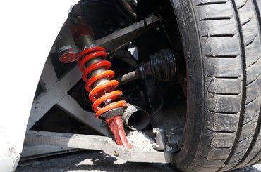Az egyik összetörve állt, jól látszott a kifordult féltengely és az is, hogy a lengőkar a kerékagyhoz két vékonyka csavarral csatlakozik, ez nem véletlen: ha baj van, akkor itt törik, a gólyaláb a helyén marad, nem sérül a váz, csak a kerék fordul ki.
