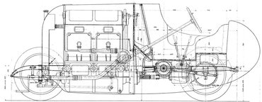 A négy dugattyú mindegyike 190 mm átmérőjű, a löket pedig pontosan 250 mm volt. Ez a hatalmas gép 290 lóerőt teljesített 1900-as fordulatszámon. A komoly nyomaték hátsó kerekekre való átvitele lánchajtással történt. Az egyenként több mint 7 literes hengerek mindegyikében három gyújtógyertya dolgozott, az üzemanyag-keveréket 75 mm tölcsérnyílású karburátorral állították elő. A járművet leginkább sűrített levegővel lehetett beindítani, bár volt kurblija is.