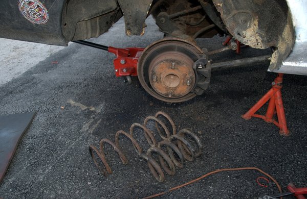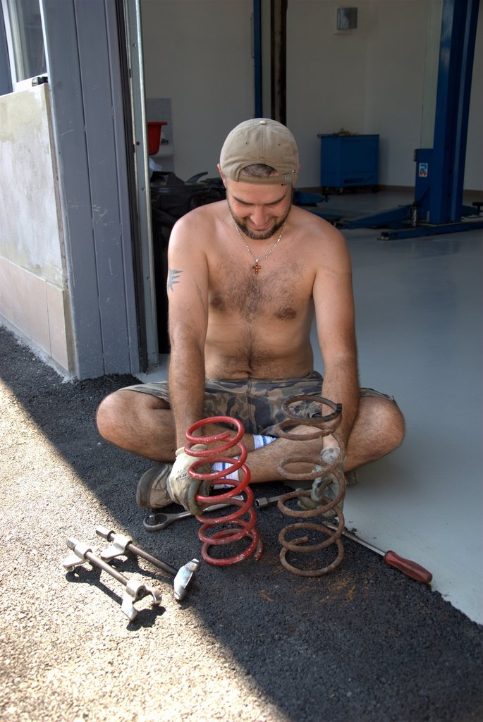 Összecsiszolódott csapatként olyan feltartóztathatatlanul haladtunk előre, hogy magunk is meglepődtünk. Miután elkészültünk a fékkel, ha már arra jártunk, kiborítottuk az első gólyalábakat. Találtunk ugyanis az autóban két pár rugót, amiket kár lett volna a csomagtartóban rohasztani. A két piros - mint később kiderült - egy méltán híres Szivák-féle szett előre; egy milliméterrel vastagabbak a gyárinál, és rátehénkedve érezhetően keményebbek. Befűztük gyorsan, valamivel lejjebb is került a Corolla orra, mi pedig cselekvési kényszerbe kerültünk, mivel ha így marad, még alulkormányzottabb lesz, amit életünk árán is megakadályoznánk.