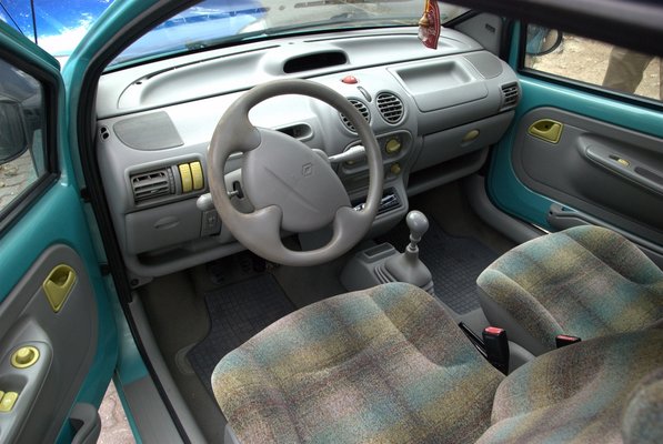 Bamugartner-matrica és utólagos gumicsík az ajtókon. Ott, ahol a legszélesebb az autó, nem ott, ahová gyárilag rakták. Mondjuk ez nem baj. A vezetőülésen van egy csúnya szakadás, rajta egy olcsó, borzalmas üléshuzat, de ezt leszámítva a beltér szép, tiszta, nincs bagószag és összevissza karcolt műanyagok. Szerencsére nincs két egyforma Twingo, így mondjuk egy színhelyes szivargyújtó pótlása is macerás, ezt a bordót kihúzva látszik, hogy soha nem dohányoztak benne.