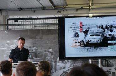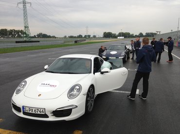 Összegyűlünk odabent, és elkezdődik az eligazítás. Nem először vagyok Porsche-eseményen, és mindig lenyűgöz, hogy mennyire rokonszenves vállalat, pont az ellenkezője, mint amilyennek az átlag Porsche-tulajdonost elképzeli az átlag irigye. Szakszerű és rendezett, de közben vidám és oldott, a frankómegmondás és az intelligensebb testnevelőhumor őszinte és szerethető elegye. Jan Kalmar, a dán vezető instruktor egyszerűen lenyűgöző, úgy mókás, hogy ösztönösen vigyázzba akar állni előtte az ember Mindjárt az elején keményen kezdünk: 50 éve készítjük a világ legjobb sportkocsiját. Azt, amihez mostanra minden mást mérnek. De a ti piacaitokon (Azerbajdzsán, Moldova, Kazahsztán, Fehéroroszország, Ukrajna, Magyarország, hogy csak a hangulatosabbakra térjek ki) nem innen ismernek minket, hanem a [kocsisort a szembesávban dudálva előző, levegőbe géppisztolyozó] Cayenne-ről és a [burgonya formájú, lézerblokkolóval pályabüntető] Panameráról. Márpedig a Porschét elsősorban a 911 határozza meg, a 911 a porscheség maga. Ezzel akarunk benneteket megismertetni ebben a két napban.