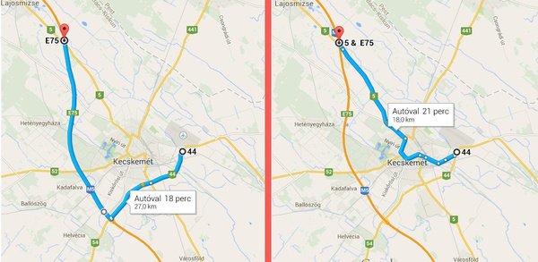 Régóta hiszek benne, hogy hétvégén, amikor kicsi a forgalom, nem érdemes elkerülni Kecskemétet az M5-ösön, egyszerűen azért, mert óriási kerülőt jelent, ha az ember a 44-es út felé, azaz Békéscsaba irányába megy. Ha már kísérlet, ezt is kipróbáltam. Lefelé menet át a városon, kis forgalom mellett, a csodálatos zöldhullámot kihasználva 17 kilométert tettünk meg 18 perc alatt. Visszafelé az elkerülő útszakaszon haladva 27 kilométer volt az út, ami szintén 18 percig tartott. Íme a két útvonal (senkit se zavarjon meg a Google Maps-féle menetidő, ez hétköznap estére vonatkozik):