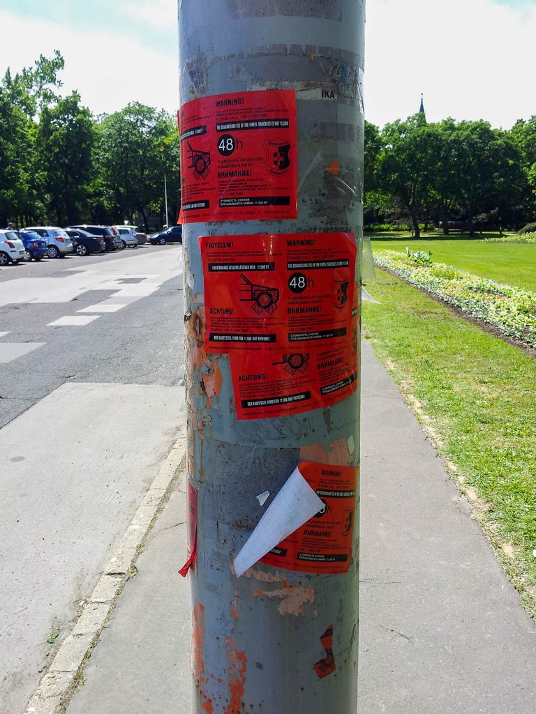 Amikor Gábor megkapta a kerékbilincset, először az tűnt fel neki, hogy a mögötte álló autókon nincs, ugyanakkor a szomszédos villanyoszlop tele van ragasztgatva azokkal a piros matricákkal, melyek a korábbi bilincselésekkor ragaszthattak a megbüntetett autók ablakába, a tulajdonosok pedig az oszlopra. Ezekkel figyelmeztetnek, hogy véletlenül se induljon el az autós, mielőtt 11 500 forintért leszerelteti a bilincset. A bilincsleszerelési díjon felül további 20 ezer forint szabálysértési bírságot is kiszabtak Gáborra, és minden hasonló esetben ezt teszik a törvény alapján.