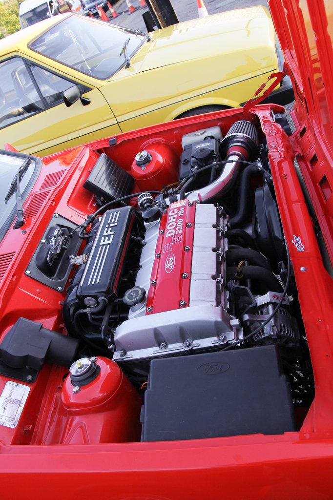 A gyönyörű, megőrzött állapotú Fiestákon kívül voltak átépített darabok is, méghozzá igen szépen kivitelezett autók. Azért a 2.3-as, 16 szelepes motoros Fiesta elég izgalmas lehet – ez a motor, ha gyári állapotú, akkor is 145 lóerőt és 210 Nm nyomatékot tud. Egy kábé 750 kilós bódéban talán nem csak mosolyt tud az ember arcára csalni, de a páni félelem hideg verejtéke is kiverheti, ha meggondolatlanul tapossa a gázpedált.