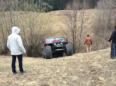 Hogy kipróbálhassuk, Bukarestből elmentünk a Kárpátok legelhagyatottabb vidékére, Lopatari környékére, és hát a csapatás után mi körülbelül annyit tudunk hozzátenni mint nem szakújságírók, hogy hűbazmeg. A Rescue tényleg mindenhol elmegy, teljesen valószínűtlen helyeken, meredek, sáros hegyoldalakon, elárasztott vízmosásokban, ott ahol gyalog se evickélnénk át, nemhogy autóval. És közben feltűnően nem erőlködik. A kisebb tereptárgyakat (fák) pedig egyszerűen elgázolja, körülbelül úgy, ahogy egy lánctalpas tenné. Ja, lánctalpat egyébként szintén lehet rendelni hozzá.
