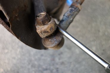 Jött a harmadik módszer, ami a legkevésbé szokott célra vezetni, ha összerohad a cucc: egy nagy csavarhúzóval befeszítesz a gömbcsukló alá, és szemből ráütsz egy óriásit a kis karra, amiben ő szorul. Némi püfölés, anyázás, további püfölés után szét is ugrott – ez volt az a mozzanat, amitől féltem, hogy esetleg nem sikerül, itt megnyugodtam. Gyűlölök gömbcsuklót kiszedni, szívtam már ilyennel eleget, most viszont könnyen ment, talán köszönhetően a jó minőségű futóműalkatrészeknek.