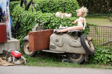 Szakadjunk el az autóktól, a csarnokok hűvösétől, ilyenkor az ember először a szabadtéri, bolhapiacos részt nézi át vészes gyorsasággal, mert ha elered az eső, már akkor se tud semmit venni kint, ha az isten esőkabátját is húzza magára, mert az árusok letakarnak mindent. Igen ám, csakhogy az árusok nem egyeztettek az én listámmal – a világ összes elmúlt és leendő márkájának a fémplakettjét, motoros szemüveget ötszázféle stílusban, orosz kéziszerszámokat, világító kisjézust, Puch mopedalkatrészeket, biciklicuccokat, Volkswagen Bogár összes mindenféléjét vehetnék tonnaszám – igaz, utóbbi már a tavalyival ellentétben zárt csarnokban lakik. Ami nekem kell – az zérus.