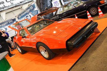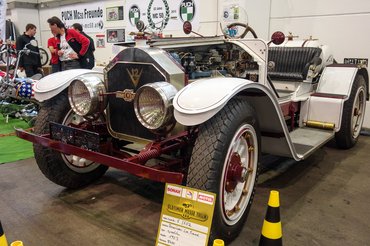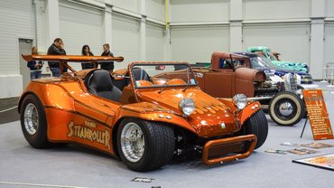 Akad ötvenes-hatvanas évek amerikai custom car-szcénáját bemutató csarnok is, az beleállít a földbe. Ültetett, kopott, ál-kopott, tuning V8-cal szerelt ősautók minden mennyiségben, tiszta American Graffiti az egész. Bár nem szeretem az ilyesféle giccset, de azért a metálnarancs, úthenger-papucsokon pihenő Baja Buggy képes lenne megváltoztatni a nézeteimet, az egyszerűen iszonyú menő. Honnan vesznek erre gumit? Mi ez rajta, dragsterről jött? És a vicc – rendes osztrák rendszáma van.
