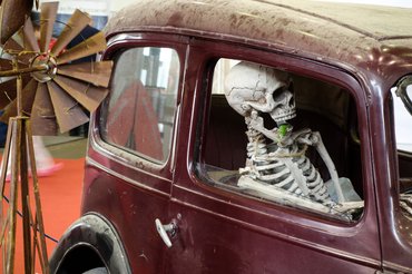 Cuki ötletekből sincs hiány. Lotus Elan áll műsziklák között, vicsorgó mormoták fenik a fogukat a műanyag karosszériára. Alatta fémtálca, benne olaj, ahogy brit autótól illik is. Csakhogy az az olaj igazából kátrány, csak a sztereotípia miatt tették oda... Kicsit odébb Austin Seven Ruby hever megfáradt poraiban, benne csontváz, számára a megfelelő klímáról állványra tett, rozsdás ventilátor gondoskodik. Másutt DKW autóalkatrészekből készült robot forgatja fejét a látogatók után, szemében valódi villanyfény. De a legjobb installációt egy Mazda motorterében fedeztem fel: mókás Wankel-dugattyú lény épp hagyományos dugattyút eszik villakezekkel... Az idő megszépíti a múltat, kicsit még a jelent is.
