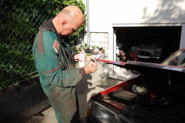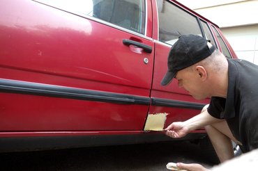 Nem akarom részletezni, megint kétkomponensű, megint késtapasz, várakozás alatt az előző napi maszkolás bontogatása, majd csiszolás orrba-szájba, ráadásul a nap is jött, kíméletlenül, márpedig napon nem lehet fújni. Iszonyatos ez a stressz. Gyorsan maszkoltam (ez volt a kocsi egyszerűbbik oldala), elővettem a festőkészletet, s a maradék, bekeveretlen festéket. Hoppá, ez itt szinte semmi. Nézem az előző napi bekevertet, nem is annyira sűrű, összeöntöttem a kettőt, beletettem egy csomó hígítót. Szinte éreztem a hátamon ezer, profin fényező olvasó szúrós tekintetét, miközben ezt a szörnyűséget műveltem, de nem tudtam mit tenni, már gyűlöltem ezt az egész festékben fürdős, hígítóban órákon át szerszámokat és kezet áztatós, ragadós, elbaszós dolgot.