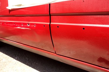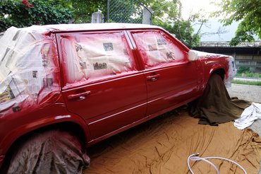 Kompresszort beállítottam 4 barra, sok-sok levegőt állítottam a pisztolyon és kevés festéket, gondoltam, majd ha jól megy, kicsit változtatok rajta. Brr, mondta Parkside úr tüdeje, meghúztam a ravaszt és finoman pirosodni kezdett a Volvo oldala. Hú, ez baromi jó, tényleg botorság szpréből fújni, ha van profi cucc is. Jó a Lidl-es pisztoly, oldalról is befúj levegőt a festékáramba, így lehet állítani a fújási képet, baromi finoman lehet vele dolgozni, még én is viszonylag egyenletesre festettem az ajtókat. Sajnos sose érzem a határokat, nálam mindig megfolyik a festék, most is megtörtént, az első ajtó keretén elindult egy gonosz csepp lefelé. Mindegy, már volt rajta folyás előtte is...
