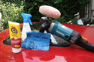 A vízpapír arra kellett, hogy a durva felületeket (az összeköpködött ajtók alját, a motorházfedél éle és vízszintes része közti részt, a teljes csomagtérfedelet, a sárvédőíveket kivétel nélkül) nagyjából simává tegyem, mert a polírozást csak a pici mattság és karcok eltüntetésére alkalmas, pláne ha a G3-ast használom. Az Erát például G6-ossal políroztam, az azért sokkal többet lehozott, de ott is vízpapírozgattam egy-két részt.