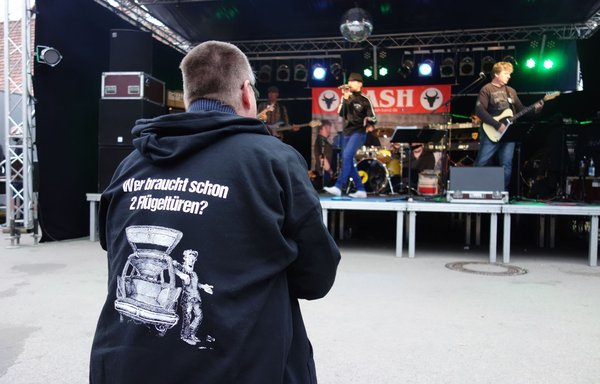 A magyar banda – voltunk bő harmincan – lezúdult a buszról és megcélozta A Sört. Régebben vicinálisabbak voltak az árak, ha jól rémlik, két euróért kapta az ember a VdH-Treffen (a klub neve teljességében kiélvezhetően: Verein der Heckflossenfreunde e.V./MB strichacht IG) korsót, utána egyért az utántöltést. Most bilétás és jelöletlen korsós lett a rendszer, ráadásul 2,50-et kérnek a sörért – az már nem annyira vicces. Azért nyeltük rendesen.