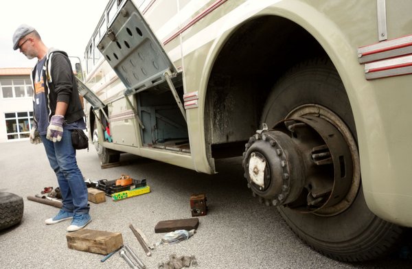 A busz alig három héttel az út előtt került vissza Németországból Magyarországra, a tulajnak alig volt ideje pár dolgot rendbe tenni rajta. Fék, futómű persze megvolt, kapott egy felújított adagolót és hengerfejet, egy levegőkompresszort, elektromos átnézést. Két új első gumi is felment, ám nem volt raktáron több elérhető, azokat egy hónapos szállításra ígérték, ezért a tökéletesnek tűnő hátsók úgy maradtak. Nos, az egyik futófelülete megadta magát, a levegő nem szökött el ugyan, de ki kellett cserélni.