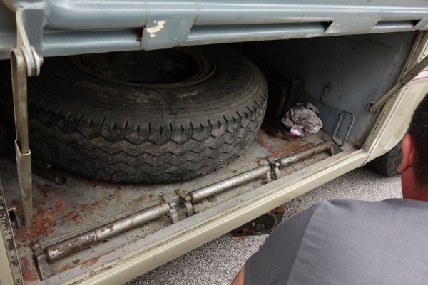 A leszakadt darab ott tapsolt a kerékdobban – mellesleg épp az én térdhajlatom alatt. Izgi dolog a kerékcsere egy ilyen buszon: viszonylag kicsi olajemelő elég alá, de a kulcsok, amik leszedik a kereket, nagyon nem személyautós méretűek. A pótkerék az egyik oldalsó dobozban lakik, s hogy könnyű legyen kihúzni, a padlóban görgők vannak – nesze neked Kia az új Sportspace görgőivel.