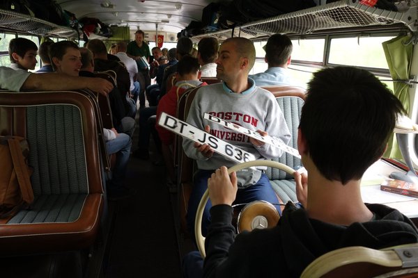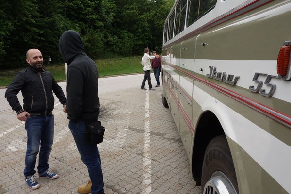 Hoppá, egy 1970-es Ikarus 55, Németország felé, rajta háromtucatnyi öregautó-buzival – ilyenre jó eséllyel nem lesz több alkalom. Hamar betelt a létszám, mondanom sem kell, pláne, hogy sokan gyereket is neveztek. Én is, Bálintot, őbenne biztos voltam, hogy bírja majd a gyűrődést a monomániások között.