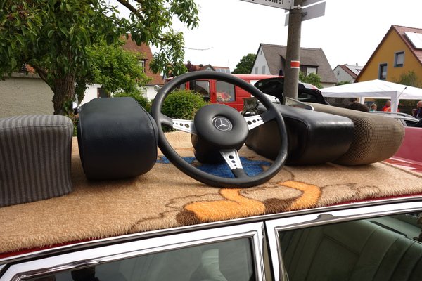 Magyar barátaim rommá vásárolták magukat, a buszt lassan megtömték a cuccokkal. Azért az árusoknál hagytak néhány meghökkentő tételt, például a gyári, háromküllős, Mercedes-középpárnás (Pralltopf) sportkormányt, ilyen volt a Vörös Disznóban is (itt, 6.20-nál a kormány is látszik), az első AMG-versenyautóban, amit egy W109 300 SEL 6.3-ból csináltak, de 6,8 literesre tolták fel a motort. Ralihasználatra szánt Mercedesekbe is tettek ilyet, de még így is alig pár száz készült belőle. Az ára? 1700 euró – stílusosan egy makulátlan 6.3 tetejéről árulták.