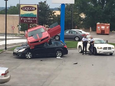 A napokban Maryville városában történt meg ez a furcsaság, méghozzá egy élelmiszerbolt parkolójában. Az áruház alkalmazottjai az eset után elmondták, látták a piros Camaro vezetőjét kikászálódni autójából, de nem látszott rajta, hogy megsérült volna. Azt viszont ők sem tudták megmondani, hogyan került a Chevy a japán kombi tetejére.