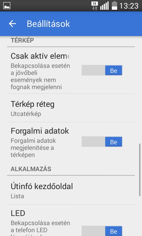 Vannak érdekes területi beállításai, tehát budapesti autósként nem kell a kecskeméti baleseti értesítéseket olvasgatnunk és egyszer sem fagyott le a teszt során. Ezt el kell ismernem, mint ahogy ígéretes funkció a "Csak aktív elem" nevű, amely alatt azt írják, hogy bekapcsolása esetén a jövőbeli események nem fognak megjelenni. Nem tudom, hogyan értelmezhető ez a közlekedési balesetek világában, de várom a fejleményeket.
