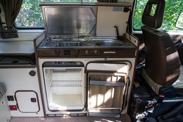 Vegyük sorra a speciális berendezéseket a műszerfalól hátrafelé haladva. Az első ülések forgathatóak, a vezetőé 90, az utasé akár 180 fokkal. Ha a két első ülést szembe fordítjuk, berakhatunk közéjük egy gyári asztalt. A vezető mögött konyhablokk, benne gázrózsával, egy kis mosogatóval és hűtővel, ami hálózatról, akkumulátorról vagy gázról is üzemeltethető. A konyha mögött találunk egy beépített szekrényt, aminek a tetejéből kihajtható egy asztal a hátul ülőknek. Az általunk tesztelt buszban ugyan nincs, de rendelhető volt a jobb első ülés mögé egy párnázott tárolódoboz, amin menetiránynak háttal lehet utazni az anyósülés támlájának dőlve.