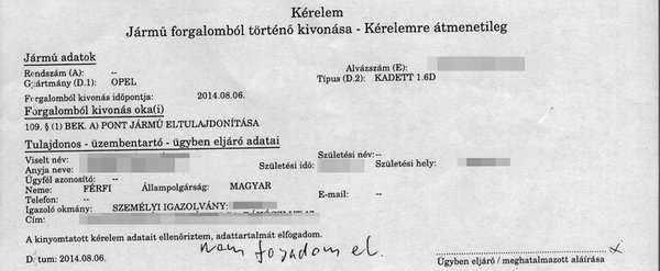 Miután elmondta, hogy az 1983-as Opelt ellopták és több határozat született már arról, hogy végleg ki kéne vonni a forgalomból, az ügyintéző mindezt úgy értelmezte, hogy az egykori tulajdonos nyilván ki akarja vonatni a forgalomból egy időre, ezért elindította az ideiglenes forgalomból történő kivonás nevű eljárást.