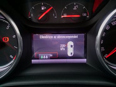 Az új Astra keréknyomás-ellenőrző rendszere. Természetesen a bejelzett kerék nem volt leeresztve, amúgy véletlenszerűen összesen három keréknél is jelzett. Aztán egynél sem