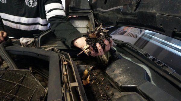 Minden, amit ezen felül csinálni kellett, az az iszonyatos elhanyagoltságból és a taknyolásból ered. A motortér vízelvezetőiből és a szélvédő előtti árokból egy egész szemétkosárnyi disznóságot, egész diót, komposztot és sarat szedtünk ki, majd egy hosszú drótdarabbal fellazítottuk és kiöblítettük. Az a sárgásbarna dzsuva – ami kifolyt alul – mutatta, hogy jó munkát végeztünk. Estére nyitva hagytuk a géptetőt, hogy kiszáradjon minden. Ja, a géptetőn belülről ott a hibátlan szigetelés, nincs szétrágva és megtépve, egyben van, abszolút korrekt.