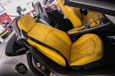 A listán volt még egy új fejegység, két hangszóróval, valamint a kárpitozás. A sárga bőrből nemcsak az ülésekre, de az ajtókra, a kézifék- és váltószoknyára, valamint a kormányra is jutott. Emellett a Rieger-elemek kaptak egy színazonos csíkozást. Mivel a bajor babakék ettől erősen elüt, az emblémákra szürke fóliát tettek a fiúk, hogy kicsit tompítsanak a kontraszton. Ha az új tulajnak mégis hiányozna a kék, a lábtérvilágítás színét most már arra is be tudja állítani.