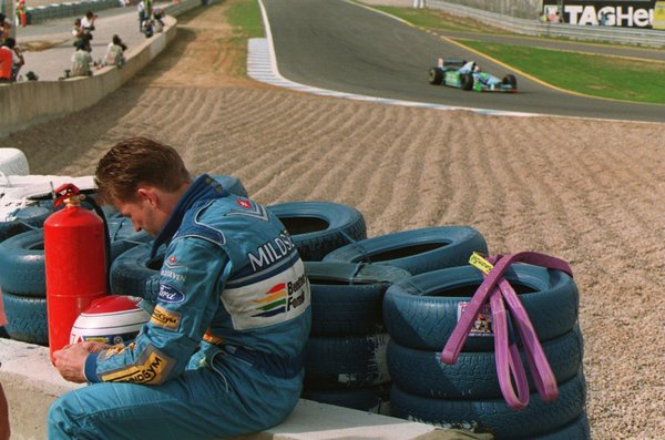 Jos Verstappen ül a gumifal mögött Jerezben, miközben a pályán éppen akkori csapattársa, Michael Schumacher halad el. Schumi a Benetton-Forddal meg is nyerte azt a versenyt (az 1994-es Európa Nagydíjat), míg a holland tizenkét kör után kicsúszott. Nem mellesleg abban az esztendőben szerezte meg első világbajnoki címét Schumacher. Verstappen tíz ponttal lett a tizedik. Fia, Max ma már a Forma-1 történetének legfiatalabb futamgyőztese. A fater soha nem állhatott a dobogó legfelső fokára.