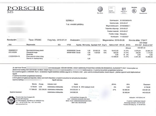 Amikor Zsuzsa május 26-án kötelező szervizre, átnézésre és műszaki vizsgára vitte a 2010-es évjáratú Skoda Superbet a Porsche M5-höz, arra számított, hogy a számára hibátlannak tűnő autó karbantartása nem lesz drága. Tévedett, mert jóllehet a nekünk elküldött Javítási megrendelőlapon 150 ezer forintos várható költségről írnak, végül háromezer forint híján 500 ezret hagyott a kasszánál két nappal később.