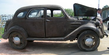 Egyébként pedig közel akkora meló lenne ebből a példányból szép Toyoda AA-t faragni, mint venni néhány tábla lemezt, néhány vég bőrt, oszt elkészíteni a semmiből. A kocsi motorja például már nem a Toyota-féle 3,4-es, hanem egy ahhoz hasonló GAZ-12-es blokk. Ezt egy olvasónk vette észre, mert még a Louwman is úgy tudja, Chevrolet-motor van benne - lesz még itt talány bőven. A kormány, a műszerek, az első lökhárító Pobjedáé, a kerekek, sőt talán a futómű is valami teherautóról került át. Cirill feliratosak a műszerek, a kapcsolók, az ajtókon a belső fogantyúk GAZ-származékok, töröttek az üvegek, az orr-részt pedig teljesen átalakították. Vajon hogyan törték azt össze? Hiszen ezzel a kocsival nem mozogtak sűrű forgalomban, pláne nem gyorsan. Amikor már kidobásra ítéltnek gondolták, de még ment, fát döntöttek vele? Egy másik autót kellett beindítani tolással? Részegen a sziklának hajtottak vele? Sose tudjuk már meg.