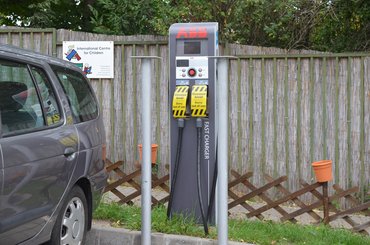 Ha azt nem is tudták fejből megmondani a tűzoltóságon (ahová már direkt nem is vittük magunkkal a kamerát, nehogy valaki kikapjon a feljebbvalójától egy nem szabályszerű sapkaviseletért), hogy merre lehet a keresett chademo-töltő, gyors guglizással (tisztelt bíróság, nem mi voltunk, hanem a tűzoltók, és még csak nem is kértük őket ilyesmire, maguktól gugliztak), arra jutottak, csak egy helyen lehet ilyesmi. Az E-on telephelyén. És itt a fejemre csaptam, hogy ó én hülye. Hogy ez miért nem jutott az eszembe?