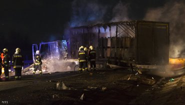 - Keresztbe fordult az úttesten és teljes terjedelmében kiégett egy alkatrészeket szállító kamion az M7-es autópálya Letenye felé vezető oldalán, a 214-es kilométernél, az érintett szakaszt lezárták - közölte honlapján csütörtök hajnalban az Országos Katasztrófavédelmi Főigazgatóság. Az oltás és a műszaki mentés idejére a sztráda Letenye felé vezető oldalának érintett szakaszát teljes szélességében lezárták, a forgalmat a sormási pihenőn keresztül terelik. A Zala Megyei Rendőr-főkapitányság az MTI megkeresésére közölte, hogy személyi sérülés nem történt, a baleset körülményei egyelőre tisztázatlanok. Az MTI a helyszínről úgy tudja: a magyar redszámú, autóalkatrészeket szállító kamion megcsúszott és keresztbe fordult az autópályán. A sztrádát teljes szélességében elfoglaló jármű rakománya és vezetőfülkéje is kiégett. (MTI)