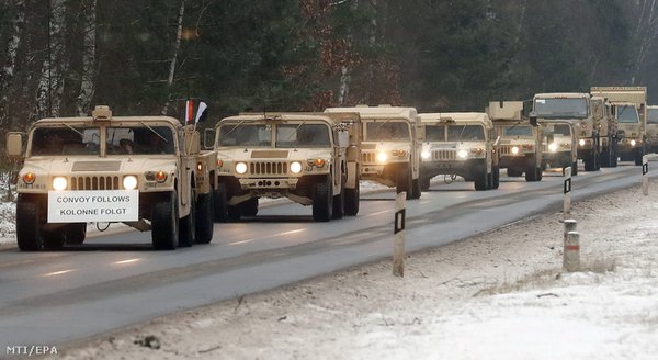 Az amerikai hadsereg negyven katonai járművéből álló konvoját vezeti egy autó az észak-németországi Brück közelében 2017. január 11-én. Három nappal korábban több mint 2500 járművet szállított Európába az amerikai hadsereg, amelyek egy része az Atlanti Megoldás nevű lengyelországi hadgyakorlaton vesz majd részt.