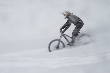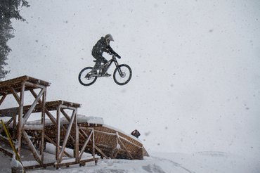 Negyedóra múlva beértünk egy igazi téli erdőbe, 30 centi hóval, iszonyat széllel. Mindegy, innen nincs visszaút, ha már a traktort is beindították, valamit villantani kell, úgyhogy lelapátoltunk egy három méter magas döntött kanyart, aztán ráengedtük, állat volt a porzó hóban. Az erdőben nem volt annyira vastag a hóréteg, ott belefért némi csapatás. Nem volt rossz, de ez azért már sok a teljes élményhez. A pálya maga zseniális, két hete lett kész, a vezetőink, Jakob és Herbert sem számítottak már a hóra. A szintkülönbség nem több száz méternél, de erre húztak egy laza két kilométeres freeride-pályát. Ez nem olyan kemény, mint a downhill, inkább ugratók és döntött kanyarok jelentik a kihívást.