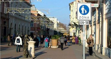 A képen egy gyalogos övezetet látni. Alaphelyzetben az ilyen zónában semmilyen jármű közlekedése nem megengedett, még kerékpárosok sem közlekedhetnek itt, sőt, azok sem hajthatnak be, akik esetleg itt laknak. (Ez alól egyetlen kivétel a mozgáskorlátozott személyt szállító jármű.)