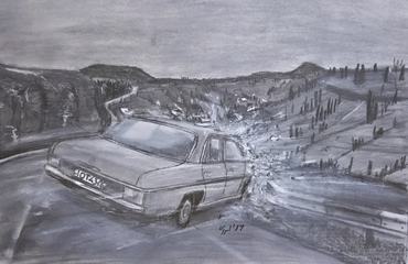 Ahogy a Dunához vezető utolsó, egyenes lejtőhöz értem, a mutató belekaszált a 130-ba, rekedten hörögtem az izgalomtól, éreztem, hogy így vagy úgy, de mindjárt vége lesz. Tararadamm, ott volt keresztben az útzár. Két, gyors egymásutánban érkező pukkanás-párral kidurrant a földkerekség talán utolsó négy darab 175 R14-es téli Vredestein Snowtrack 9-e, a makulátlan zöld stuttgarti test, amely úgy tűnt, mindent túlél majd, irányíthatatlanul pörögni kezdett, megpattant, majd egy hármas dugóhúzó után, fejjel lefelé a Duna-parti sziklákra esett.
